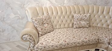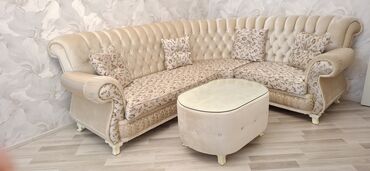 - Material: yumşaq məxməri/parça kombinasiyası; oturacaq və yastıqlarda çiçək naxışlı parça