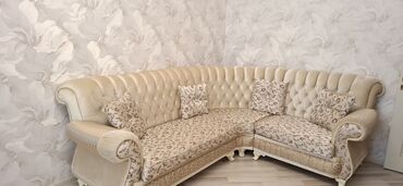 - Komplekt: 1 ədəd L formalı künc divan + uyğun üslubda yumru formalı, parça ilə örtülü kiçik jurnal masası/puf