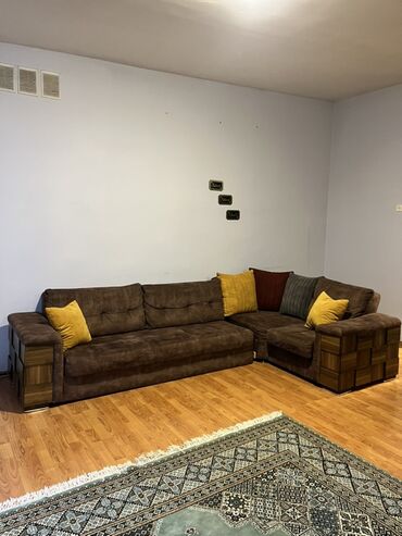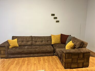 Künc divan – qəhvəyi rəngdə, yumşaq məxməri/parça üzlük. az istifade olunub - L‑şəkilli kompozisiya: geniş oturacaq hissə + radiuslu/künc modul. - Rahat yüksək arxa hissə, dərin oturacaq. - Alt hi...