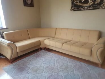 Bej rəngdə L formalı yumşaq künc divan hem bazasi var hemde kitab formasinda acilir - Dizayn: Künc (L formalı), radiuslu orta hissə ilə hamar keçidli. - Rəng/material: Bej tonlarında yumşaq parça ü...