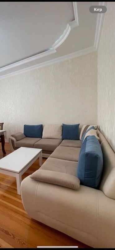 L şəklində yumşaq künc divan və ağ kofe masası