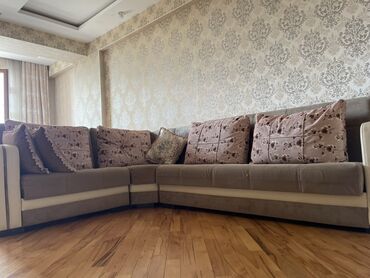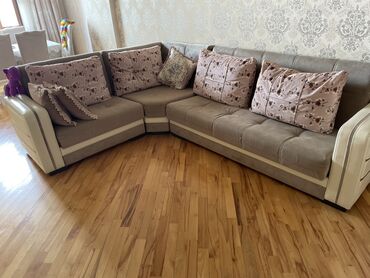Klassik üslubda yumşaq künc divan. - Rəng: krem/bej tonları - Material: eko–dəri karkas, yumşaq parça oturacaq və arxa hissə - Dizayn: kapitone (daş düyməli) arxa dayağı, hündür yan oturacaqlar, y...