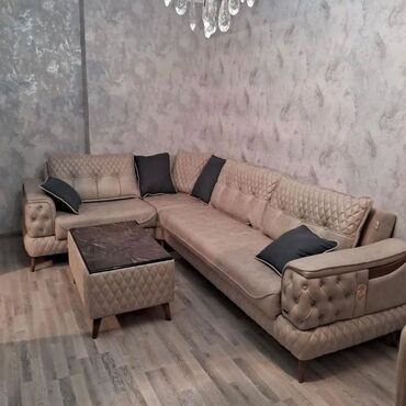 - Dizayn: L formalı künc komplekti, dərin oturacaqlar və yüksək arxa hissə ilə rahatlama üçün nəzərdə tutulub. Səliqəli tikiş xətləri, dekorativ kapitone elementlər və metal/qızılı rəngli ayaqlar zərif görünüş yaradır.