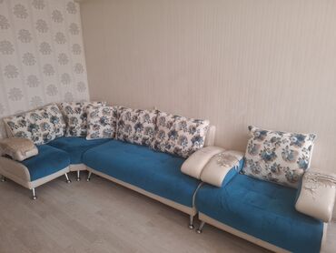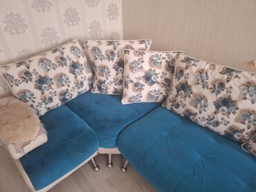- Dizayn: Modern L formalı künc konstruksiya, krem rəngli baza və mavi oturacaq hissələri ilə. Çiçək naxışlı iri arxa yastıqlar dəstdədir.