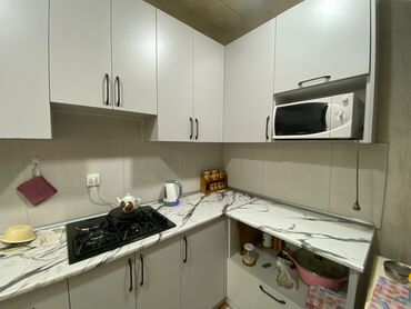 Mətbəx mebel dəsti - Aşağı dolablar: 4 bölmə, tünd rəngli mərmər naxışlı stolüstü, paslanmayan polad birgözlü lavabo və qarışdırıcı kranla. - Yuxarı dolablar: geniş saxlama üçün çoxlu qapılı modul...