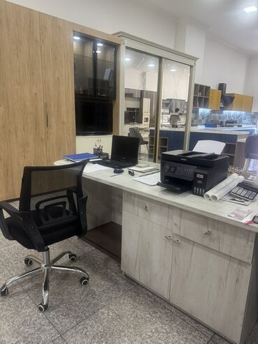 - Saxlama: Hər iki tərəfdə qapılı dolablar, çekmecələr və açıq rəflər; kompüter bloku üçün ayrıca bölmə; printer və sənədlər üçün üst hissədə əlavə meydança.