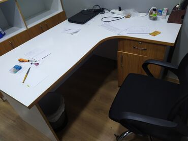 Ofis iş masası – ağ rəngdə, geniş iş səthi ilə. - Forma: ön kənarı yüngül qövsvari (ergonomik), düzbucaqlı korpus - Material: laminat/LDSP tipli taxta lövhə görünüşlü, hamar və təmizlənməsi asan s...