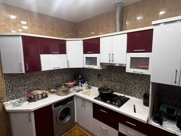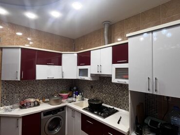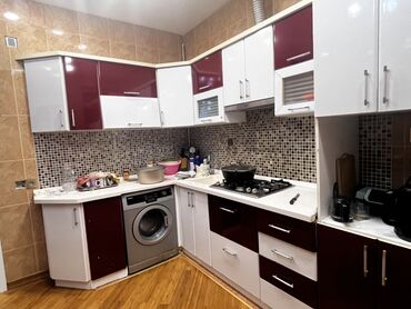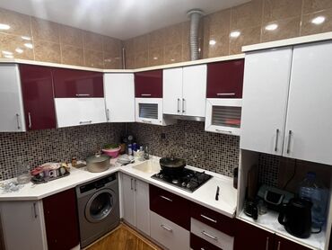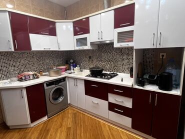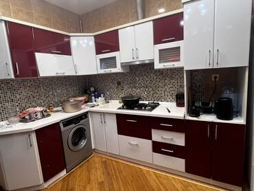 Uzerinde qabyuyan verilir .Mətbəx mebeli dəsti – L şəklində, qırmızı-ağ rəng kombinasiyası, parlaq MDF/laminat önlüklər və krom tutacaqlar.