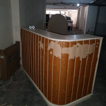 - Ölçü (təxmini): orta ölçülü, 2–2.2 m uzun ön panel, 1.2–1.4 m yan hissə, hündürlük standart resepsion səviyyəsi