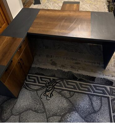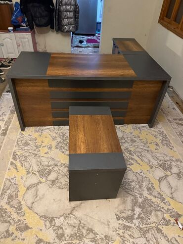 - Dəst tərkibi: böyük L formalı iş masası, qarşı tərəf üçün resepsiyon/qarşılama paneli görünüşlü ön hissə və uyğun tumba/oturacaq tipli yan element.
