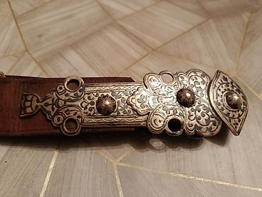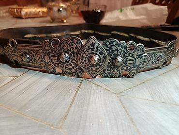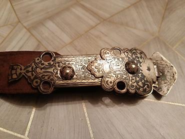 Məhsul: Qədimi Əl işi gümüş detallı dəridən geniş bəzək kəməri Təsvir: - Tünd qəhvəyi, qalın və yumşaq təbii dəridən hazırlanmış geniş kəmər. - Üzərində çoxsaylı əl oyma naxışlı metal/gümüşü rəngl...