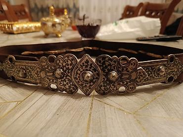 Əl İşləməli Kəmər – metal bəzəkli, milli üslub - Material: qalın təbii dəri - Bəzəklər: kəmərin bütün uzunluğu boyu rellefli metal nişanlar; ulduz və xaçvari ornamentlər, şərq naxışlı iri metal pl...