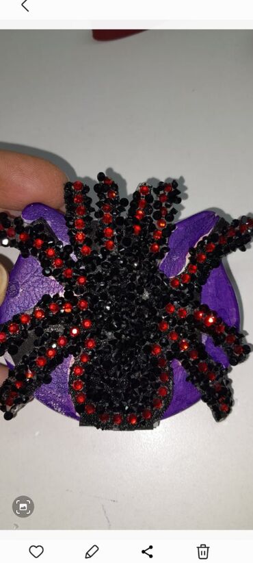 - Broş: Bənövşəyi əsas üzərində qara və qırmızı kristallarla işlənmiş hörümçək motivli broş. Geyim, çanta və ya papaq üzərində vurğu aksessuar kimi istifadə oluna bilər.