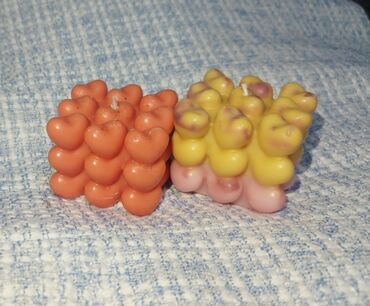 - Ürəkciqli kub şamlar: biri tam narıncı ürəklərdən ibarət kub, digəri sarı-çəhrayı tonlarda marmor effektli ürəkciklərdən yığılmış kub. Müasir interyerə yaraşan dekorativ forma.