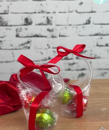 - Mini “ayaqqabı” şirniyyat qabı: Şəffaf plastik formalar qırmızı lentlə bəzədilib, içində şokolad konfetlər. Masaüstü süfrə bəzəyi və paylıq üçün uyğundur.