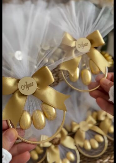 - Xatirə/souvenir halqaları: Qızılı halqa üzərində ağ tül, qızılı lent və fərdi ad yazısı ilə bəzədilmiş mini kompozisiya. İçəridə qızılı drajeler yerləşdirilib. Körpə şənlikləri, nişan, xınayaxdı və digər tədbirlər üçün fərdiləşdirilə bilən hədiyyəlik.