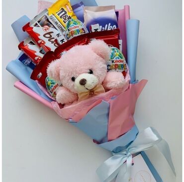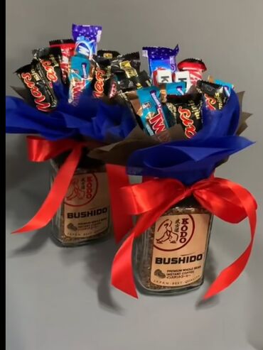 - Şokolad buketi: Bushido qəhvə bankasında qurulan kompozisiya. Bankanın üzəri mavi kraft kağızı və qırmızı lentlə bəzədilib. İçəridə müxtəlif şokolad batonları (Mars, Twix və s.) kombinasiya şəklində düzülüb – qəhvə + şokolad sevərlər üçün dekorativ buket.