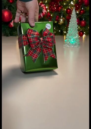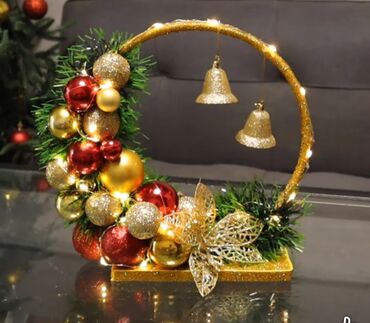 - Yeni il dekoru: Qızılı parıltılı əsasda dairəvi kompozisiya, LED işıqlar, şam ağacı budaqları, qırmızı və qızılı şarlar, həmçinin asma zənglər və dekoratif qızılı çiçək ilə. Ev və ofis üçün bayram ab-havası yaradan masaüstü bəzək.