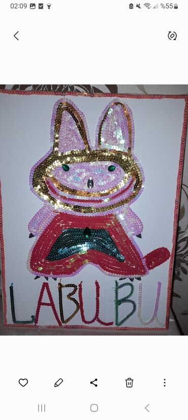2) “LABUBU” yazılı, qulaqlı sevimli fiqur – pastel çalarlarda, konturları qızılı payetlə vurğulanmış.