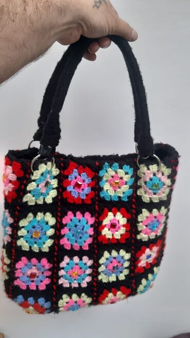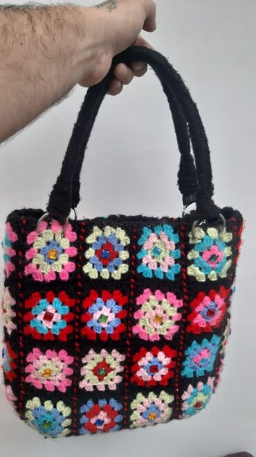 - Dizayn: Qara fon üzərində rəngarəng “granny square” motivləri, hər kvadratın mərkəzində kiçik bəzək daşı.