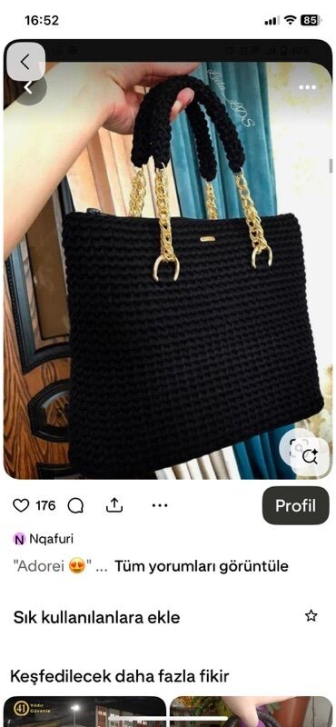 Qara rəngdə əl işi çanta - Material: qalın iplə toxunmuş hörmə korpus, iç hissə hamar qara astarlı - Dizayn: ön tərəfdə rellefli naxışlı toxuma, ortada “handmade” yazılı metal etiket - Aksesuarlar...