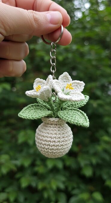 - Materiallar: Nazik pambıq ipliklə amiqurumi texnikasında toxunmuş vaza, çiçəklər və yarpaqlar; metal zəncir və halqa.