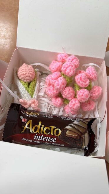 - Hədiyyə qutusu nümunəsi – çəhrayı toxunma mini buket, toxunma tülpan açarlıq və şokoladla birlikdə tərtibat ideyası (şokolad qutunun nümunəsindədir).