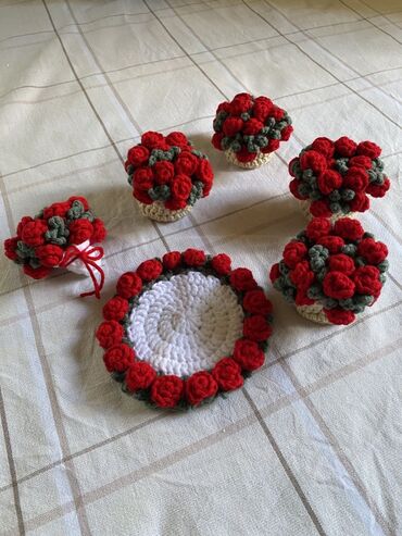 - Ölçü aralığı: mini dekor buketlər (təxminən ovuc ölçüsündə), dairəvi altlıqlar (təxminən stəkan altlığı ölçüsü), armud motivləri (kiçik aplik ölçüsü).