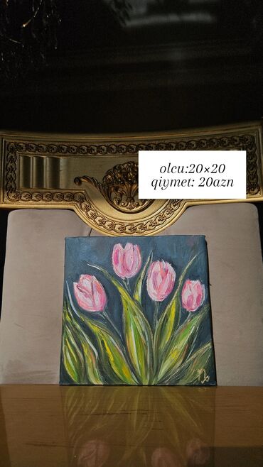 - Lalələr: 20×20 sm — 20 AZN. Beş çiçəkli kompozisiya, yaşıl-südlü fırça keçidləri.