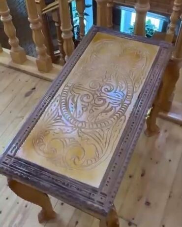 - Rəng və işləmə: təbii ağac tonları, laklanmış səth, kənarlarda əl oyma haşiyə