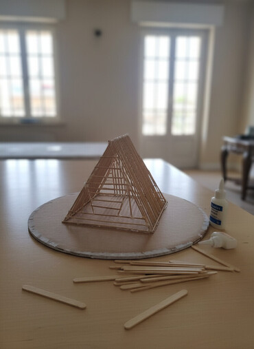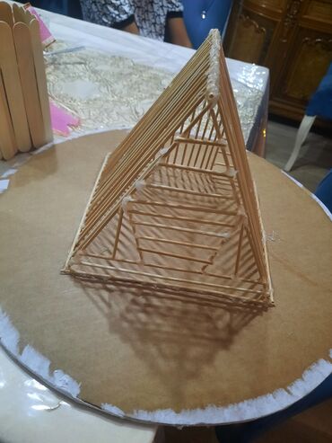 - Piramida maketi: Şiş çubuqlardan hazırlanmış açıq konstruksiya. Kvadrat baza üzərində üçbucaqlı çərçivələr, iç hissədə mərtəbəvari pillələr. Maketin ölçüsü təxminən orta ölçülüdür; karton dairəvi altlıqla təqdim olunur. Məktəb layihələri, maket və əl işi nümayişləri üçün uyğundur.