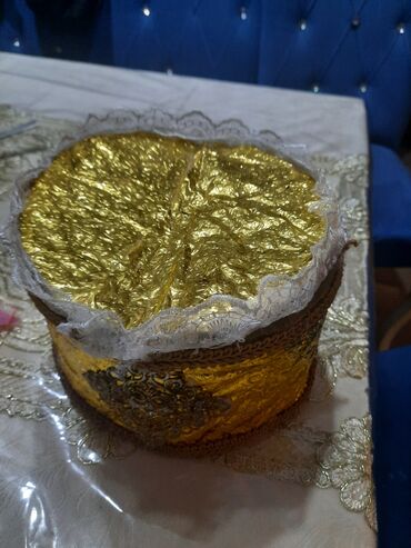 - Bəzəkli dairəvi qutu: Qızılı fakturalı örtük, yan tərəflərdə naxışlı aplikasiyalar, üst kənarı krujeva ilə haşiyələnmişdir. Daxili həcmi genişdir; aksessuar, xonça və ya hədiyyə saxlama qutusu kimi dekorativ istifadə üçün uyğundur.