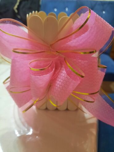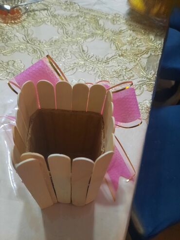 - Taxta çubuqlardan dekorativ qutu: Dairəvi uclu taxta çubuqlarla altıbucaqlı forma, iç hissəsi kartonla möhkəmləndirilib. Üst hissədə iri çəhrayı-qızılı lent bəzəyi ilə təqdim olunur. Qələm/qələmlik, xırda əşyalar, hədiyyə qutusu kimi istifadə oluna bilər.