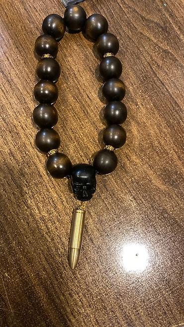 1) Böyük sferik muncuqlu model – mərkəzdə qara kəllə fiquru, ucdan qızılı rəngdə güllə formalı asqı.