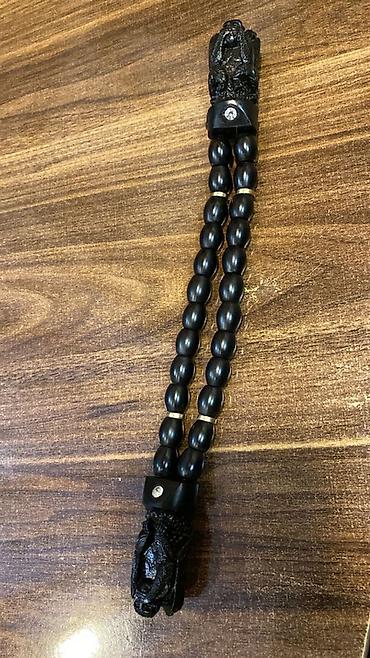 4) İkili sıra təsbeh – kiçik armud formalı qara muncuqlar, hər iki ucdan detallı oyma heyvan başı fiqurları (qara), aralarda kiçik metal halqalar.