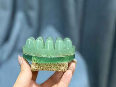 - Masaj sabunu: Yaşıl rəngdə, üst hissəsi masaj başçaları ilə, alt hissəsi loofa lifli təbii skrab qatlı. Yumşaq təmizləmə və yüngül piling effekti üçün.