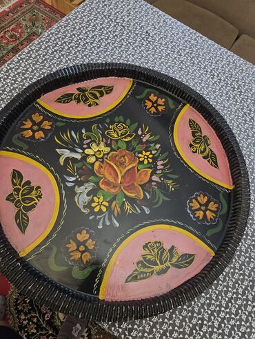 - Üzərində əl işi floral rəsmlər: mərkəzdə iri güllər, ətrafda yarpaq və çiçək motivləri