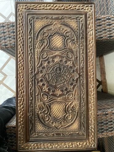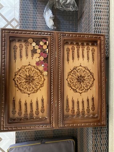 Ağacdan hazırlanmış, əl oyma naxışlı tavla dəsti.