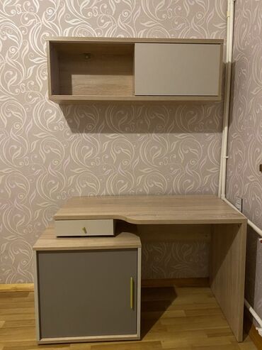 Uşaq/yeniyetmələr üçün funksional yazı masası və üst dolablı kitab rəfi - Material: ağac fakturalı laminat - Rəng: açıq ağac tonu + ağ fasadlar - İş səthi: geniş, düz künclü, sağ tərəfdə kabel keç...