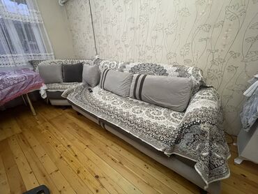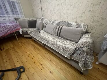 Qısa təsvir: Neytral rəngli, yastıqlarla tamamlanan, L‑şəkilli böyük künc divan və ona uyğun geniş kreslodan ibarət dəst. Rahat oturuş, dekorativ örtüklər və praktik ayaqlar sayəsində gündəlik istirahət üçün əlverişlidir.