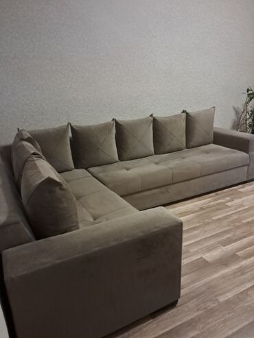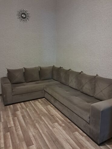 Ölçülər fotoya əsasən genişdir; sağ qol tərəfi uzun, sol qol tərəfi daha qısa künc hissə ilə tamamlanır. Modern, səliqəli görünüş və rahat istirahət üçün nəzərdə tutulmuş künc divan.