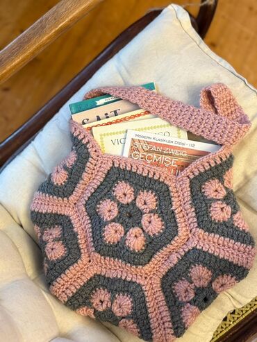 Məhsul: Əl işi toxunma çanta Təsvir: - Yumuşaq iplikdən əl ilə toxunmuş, altıbucaqlı motivlərdən yığılmış unikal çanta. - Rənglər: pastel çəhrayı və tünd boz kontrast kombinasiya. - Dərin əsas böl...