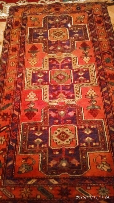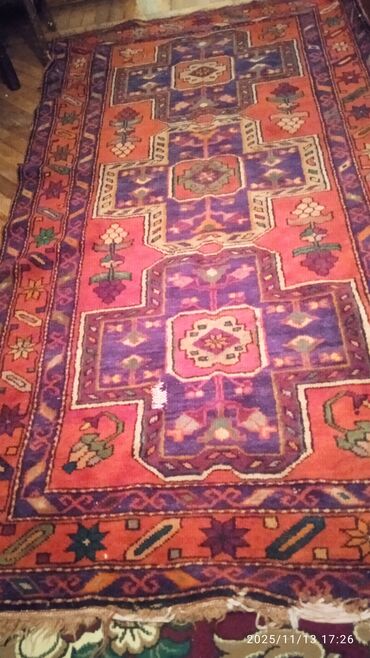 Qədimi üslubda əl toxuması 60 ilin xalçası - Material: Təbii yun, pambıq iplərlə haşiyələnmiş saçaqlar - Toxunuş: İkiüzlü sıx ilmə; arxa hissədə yun xəz payızlı-belikli tekstura görünür - Rəng pal...