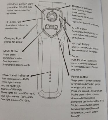 Təmiz ekran: Bluetooth bağlantısı, iş rejimi və batareya səviyyəsinin göstəriciləriYığcamvəRahat:Yüngülportativ,minidizayn,həmişəsizinlədir Xüsusiyyətlər: Tilt bucağı: 160°Yaw bucağı: 325°Fırlanma bucağı: 340° Nəzarət edilə bilən əyilmə bucağı: +30°/-30°Nəzarət edilə bilən əyilmə bucağı: +90°/-90° Nəzarət edilə bilən fırlanma bucağı: +240°/-100° İş gərginliyi: 3.4~4.2V (standart 3.7V) İş cərəyanı: 150~3000mA (standart 1500mA) İş vaxtı: 4,5-5 saat.Xalis çəki: 355 qr Yük tutumu: 280 qr Mobil telefonlar üçün tələblər: Diaqonal: ≤180mm Eni: 55-90 mm