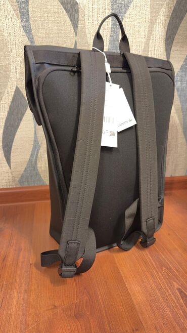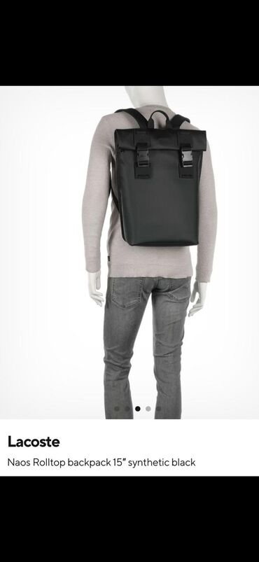 Ünvandan götürmə1. Lacoste markasına məxsus, "Naos Rolltop" model qara rəngli sintetik materialdan hazırlanmış bel çantası. Çantanın üst hissəsi bükülə bilən dizayna malikdir və iki tokalı bağlama sistemi ilə təchiz olunub. Ön tərəfində Lacoste timsah loqosu yerləşir. Çiyin qayışları tənzimlənə bilir və rahat daşıma təmin edir. Gündəlik istifadə üçün uyğun, həmçinin 15 düymlük noutbukları daşımaq üçün əlverişlidir. Sadə və praktik dizaynı ilə fərqlənir.