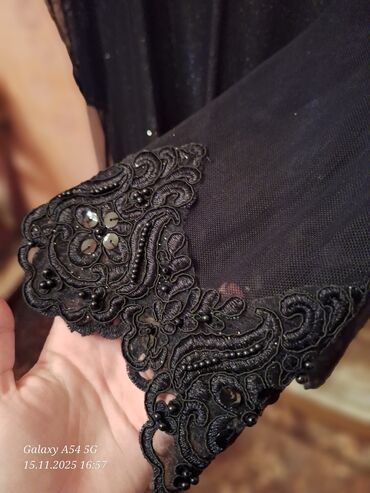 Qara ziyafət paltarı - Üst hissə: atlas effekti verən hamar qara parça, V-yaxalı dizayn - Qol: şəffaf tül uzun qollar, nazik manjetlərlə - Aşağı hissə: tam örtülü parıltılı payet/parıldayan tor ma...