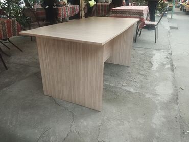 Ofis masasının təsviri: - Material: ağac teksturalı laminat (yuyulmaya davamlı, asan təmizlənən səth) - Rəng: açıq palıd/şam tonları - Ölçü (təxmini): orta ölçülü iş masası; geniş iş səthi - Konfi...