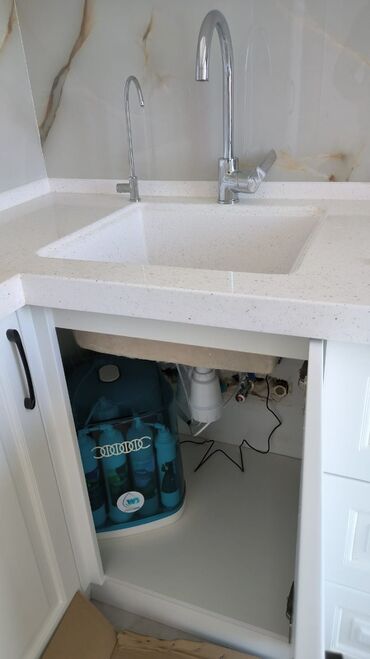 - Çoxmərhələli filtrasiya: qabaqcadan təmizləmə, karbon filtrləri və membranlq qurğu (şəffaf mavi korpusda dəyişdirilə bilən patronlar)