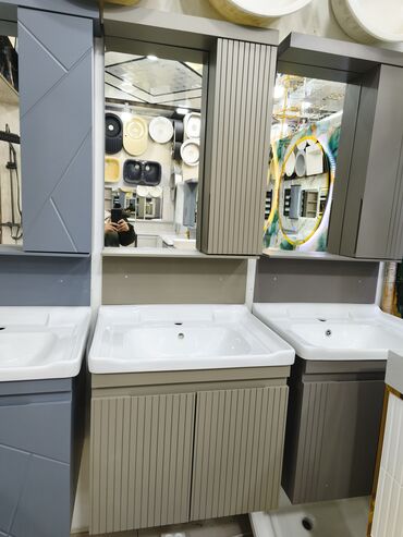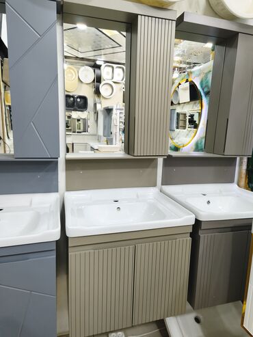 - Komplekt: Keramika (ağ) lavabo, aşağı hissədə ikili qapılı tumba; üst hissədə geniş güzgü və yanlarda saxlama şkafları.