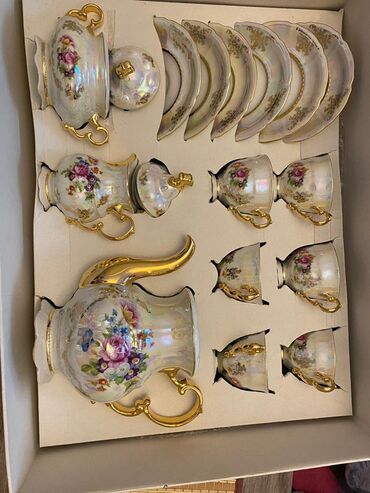 Zərif işlənmə, harmonik çiçək buketləri və parlaq qızıl detalları ilə vitrina və istifadəyə yaraşan dekorativ çay servisi.